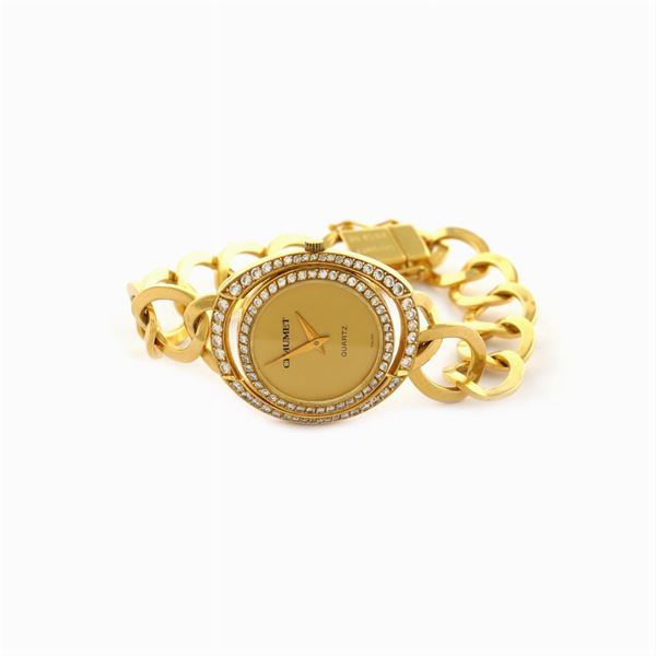 in oro giallo 18kt, cassa circolare impreziosita da diamanti taglio brillante ct 1 circa, ref. n. 2852 RE - 17433, quadrante dorato, movimento al quarzo, bracciale originale Chaumet a maglie intrecciate, firmato e numerato, chiusura a scomparsa i