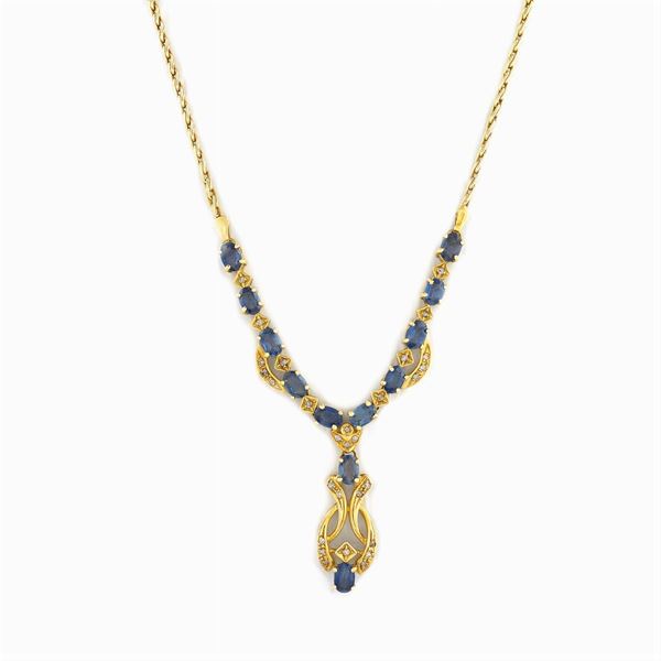 centrale pendente in oro giallo, zaffiri ct. 4 circa e diamanti taglio huit-huit, lunghezza cm. 53,5 I, peso 19,8 gr.