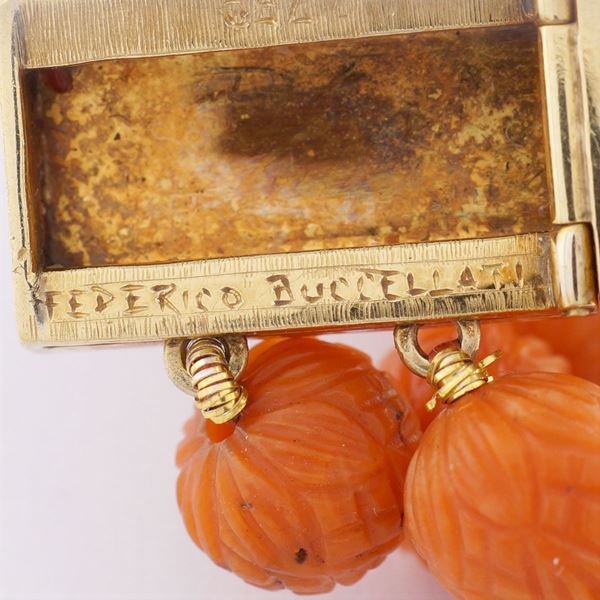 composta da due fili di sfere di corallo Sciacca inciso ed intagliato a motivo geometrico e vegetale con chiusura in oro giallo satinato 18kt e centrale in oro giallo satinato e bianco impreziosita da diamanti taglio brillante ct 0,30 circa, firmata sul centrale e sulla chiusura, lunghezza cm. 57 , peso 122.40 gr.