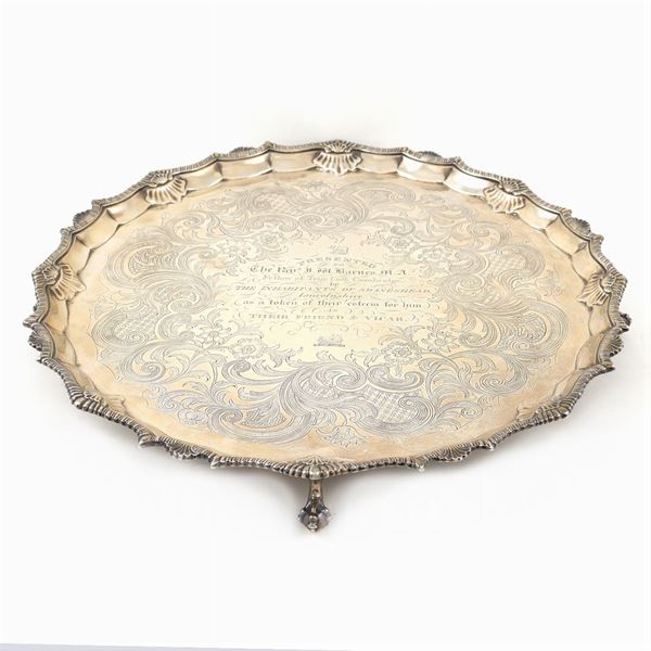 orafo Ebenezer Coker (Londra 1759 - 1772), di forma circolare con bordo mistilineo e godronato con volute, piatto decorato con motivi vegetali e floreali centrato da un'iscrizione dedicatoria, poggiante su quattro piedini ad artiglio e sfera, d. 41,5 cm.2, peso 1750 gr.