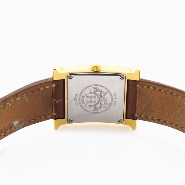 in acciaio laminato oro, cassa carrè mm. 21x30, quadrante dorato con numeri arabi, vetro zaffiro, movimento al quarzo, cinturino in pelle con fibbia originale Hermes in metallo doratow