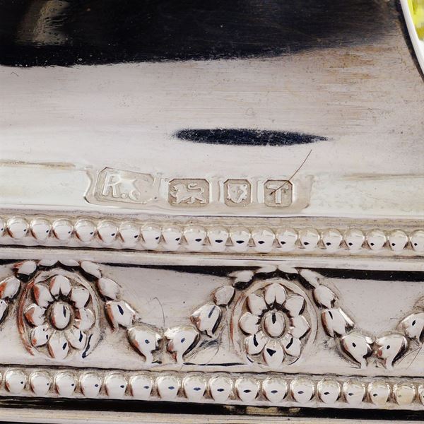 struttura a corpo liscio poggiante su base quadrata decorata con ghirlande di fiori, marchi territoriali e di garanzia impressi sulla base, orafo argentiere Spencer & co., h. 25 cm. , peso 275 gr.