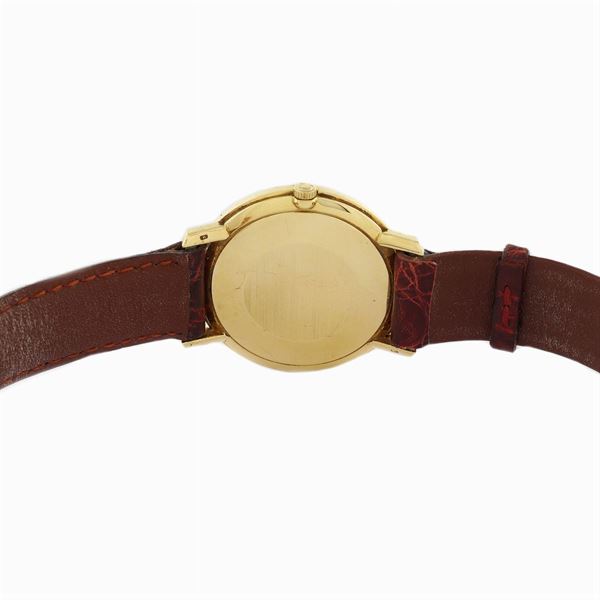 in oro giallo 18kt, cassa tonda mm. 33 ref. 111067, quadrante argentato con indici dorati, movimento a carica manuale, calibro Omega 620, cinturino in pelle con fibbia in metallo dorato