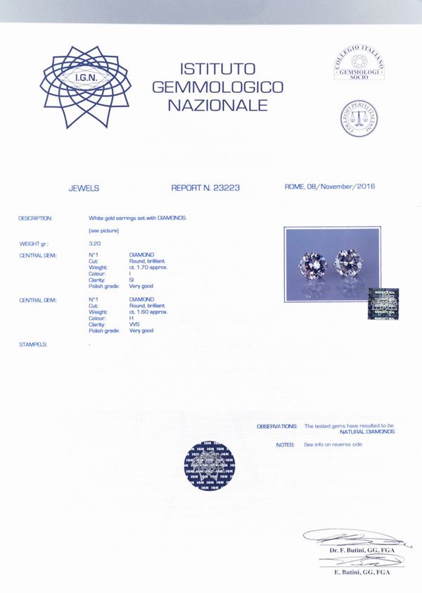 taglio brillante rispettivamente per ct 1,70 circa colore I - purezza SI e ct 1,60 circa colore H - purezza VVS. Completo di certificato gemmologico I.G.N. n.232230, peso 3,2 gr.