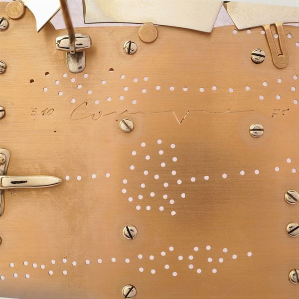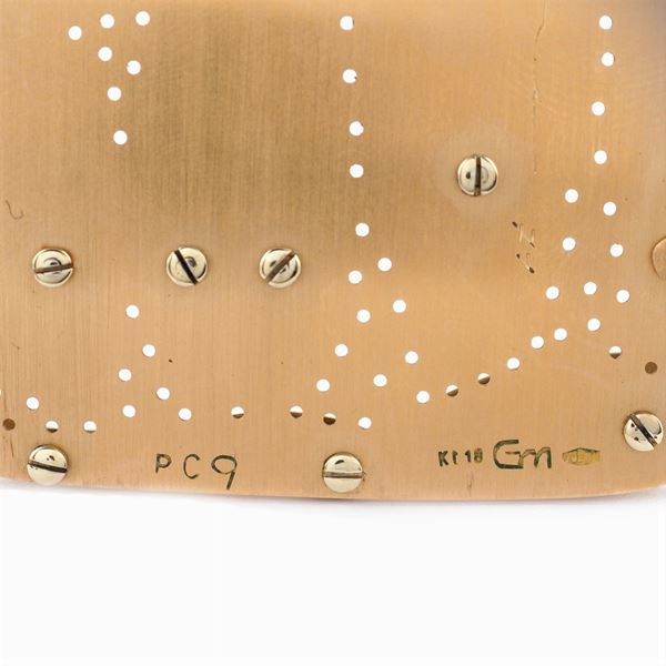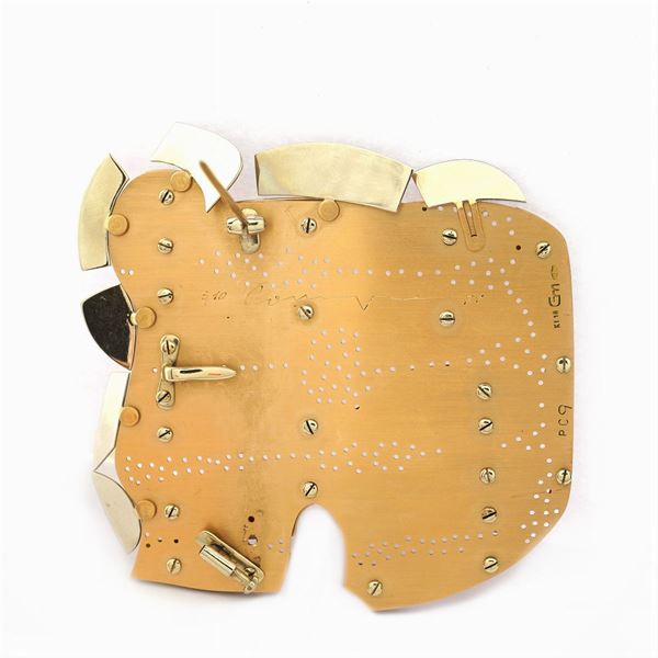 in oro giallo e rosa, es. 3/10, firmata e datata '71 sul retro, 7x6,5 cm. l, peso 49,8 gr.