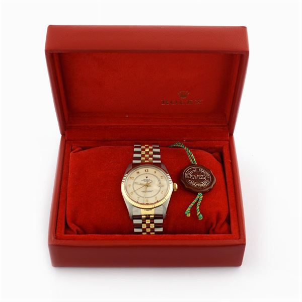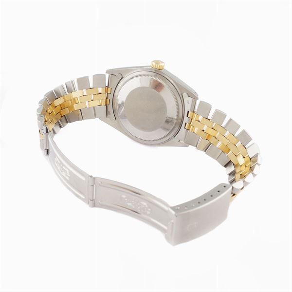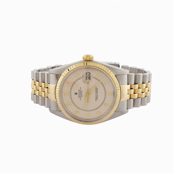 in oro e acciaio, cassa tonda mm. 36 ref. 16013 - 9219314, ghiera zigrinata, quadrante in avorio con numeri arabi in oro, datario ore tre, movimento a carica automatica, calibro RX3035, bracciale originale Rolex modello jubilee in acciaio e oro, completo di scatolam