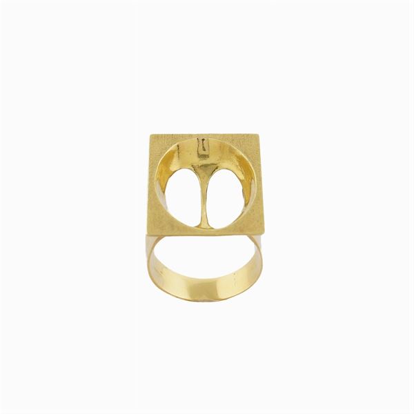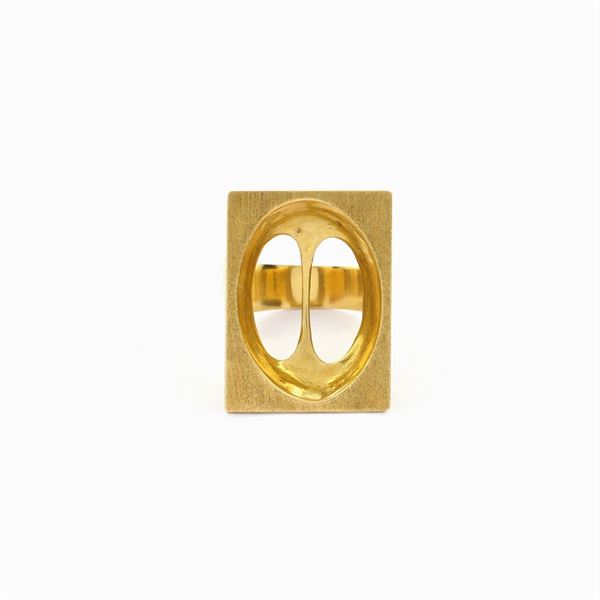 in oro giallo satinato 18kt , es. 4/6, firmato e datato '79, misura 13 P, peso 11,4 gr.