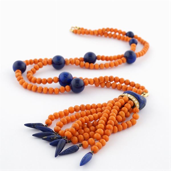 composto da un filo di sfere in corallo rosso-arancio alternate a elementi in lapislazzulo con pendente formato da nappine in corallo racchiuse da un elemento in oro rosa 18kt lapislazzulo e perline, lunghezza 43 cm.m, peso 73,6 gr.
