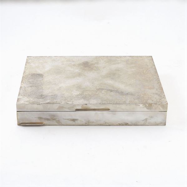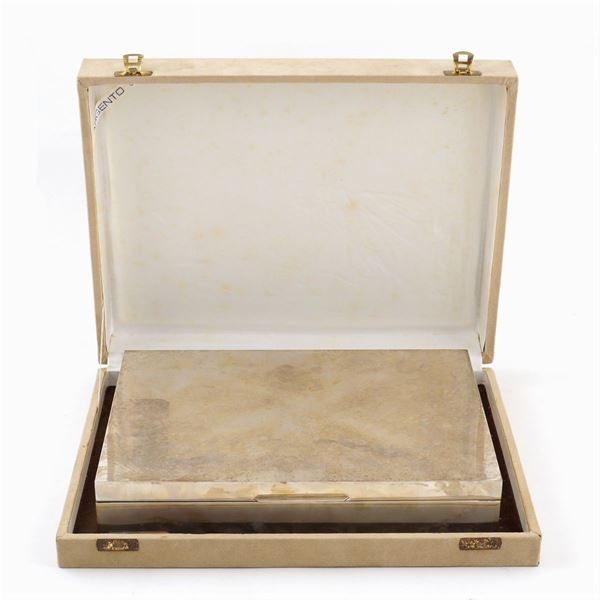 corpo liscio con interno in legno, completa di set da gioco composto da due mazzi di carte francesi, dieci dadi, fiches, matita e taccuino da gioco, entro custodia originale rivestita in acantara(, 5x30x22 cm.