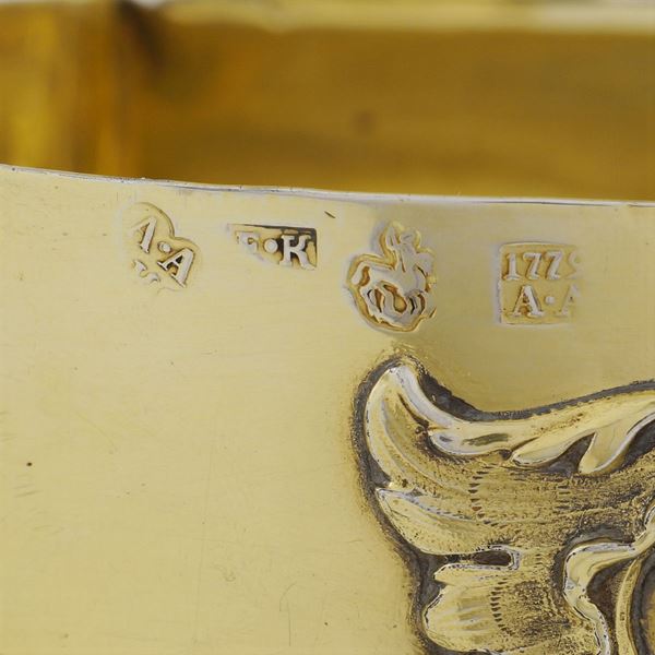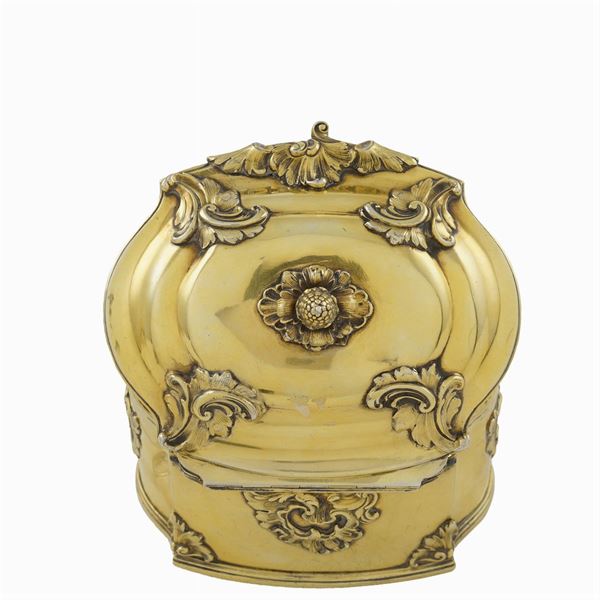 finemente cesellata con motivi vegetali, orafo Aleksèi Kosiùrev, maestro di saggio Andrei Andreyev, marchi territoriali, di garanzia e dell'argentiere impressi sul corpo, 10x13x10,5 cm.a, peso 462 gr.