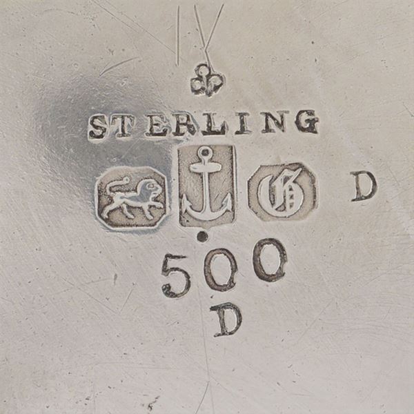 corpo piriforme inciso con motivi floreali centrato da monogramma, prese dei coperchi a foggia di putto, composto da caffettiera, lattiera e due zuccheriere di cui una con coperchio, orafo Gorham, h. massima 24 cm.s, peso 2100 gr.