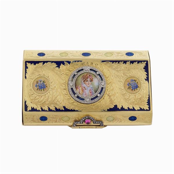 a forma di cofanetto, centrata da una miniatura in smalti policromi raffigurante busto di donna entro medaglione impreziosito da rose di diamante, superficie decorata con motivi vegetali e floreali, misure 1,5x7x4,5 cm.i, peso 93 gr.
