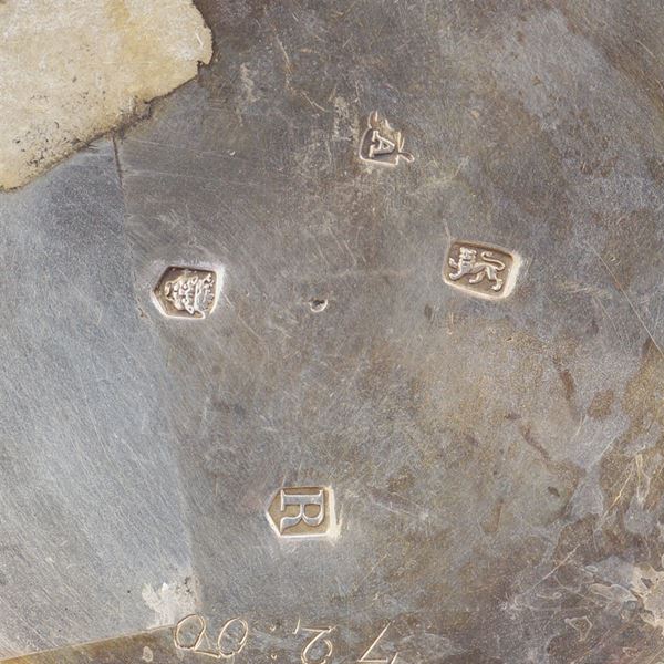 orafo Peter Archambo I (Londra 1722-1738) corpo bombato e baccellato decorato con volute e stemma araldico, manico sagomato e parzialmente rivestito in paglia rafia, coperchio con presa a balaustro, stand poggiante su tre piedini a voluta con terminali zoomorfi, h. 34 cm. r, peso 2175 gr.
