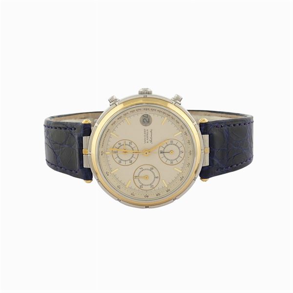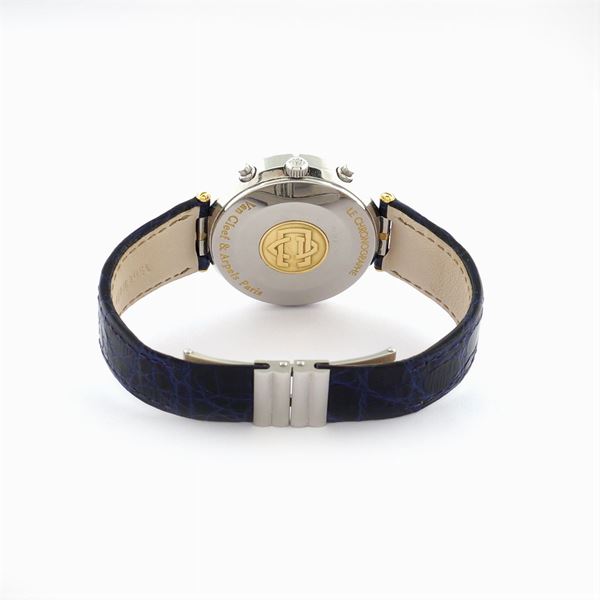 orologio da polso in acciaio e oro, cassa tonda mm. 36, quadrante avorio con scala tachimetrica, tre quadranti ausiliari con numeri arabi e romani, datario ore tre, vetro zaffiro, movimento JLC a carica automatica, ref. 424023/43445, cinturino in pelle originale Van Cleef & Arpels con doppia chiusura deployante in acciaio.