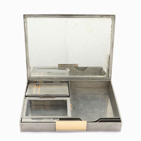 in styptor e oro rosa, impreziosita da zaffiri taglio cabochon quadrangolare, con specchio e scomparti vari interni per portacipria, portapettine, portasigarette e accendino al suo interno, firmata e numerata n. 41542i, 2x15x12 cm.