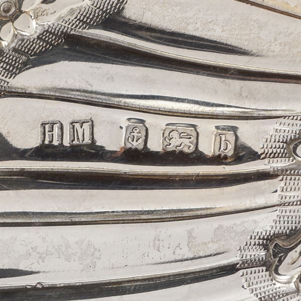 di forma rettangolare con profilo sagomato, sbalzato e decorato con motivi floreali e volute, 20x25,5 cm.S, peso 230 gr.