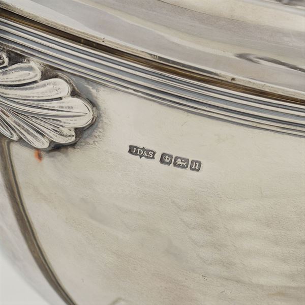 orafo James Dixon & Sons Ltd, a sezione ovale e corpo a superficie liscia, due manici sagomati con attacco a motivo vegetale, coperchio con presa ovale, 25,5x39 cm.u, peso 1918 gr.