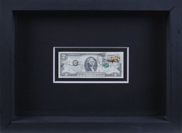" 2 Jefferson's Dollars", banconota da 2 dollari affrancata e annullata 13 aprile 1976, firmata sul fronte con marker nero, entro cornice. Il retro raffigura un quadro di Trumbull del 1816 sulla Dichiarazione d'Indipendenza Americana m, 6,8x15,8 cm.