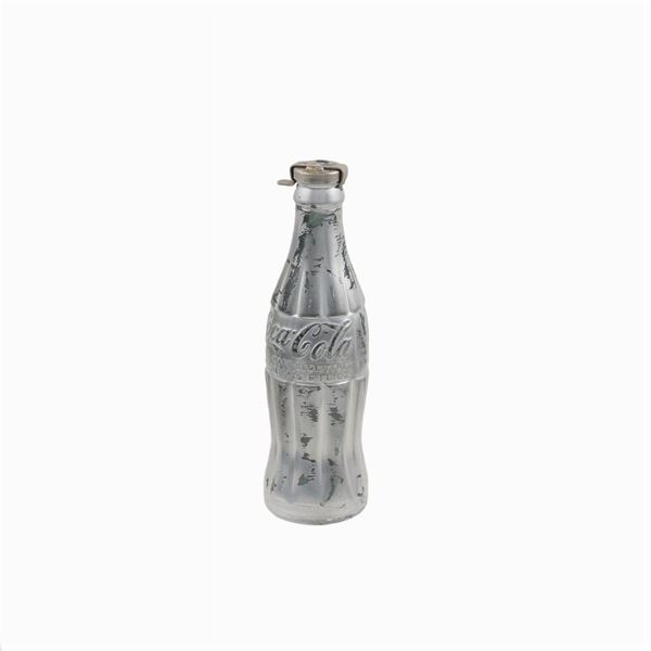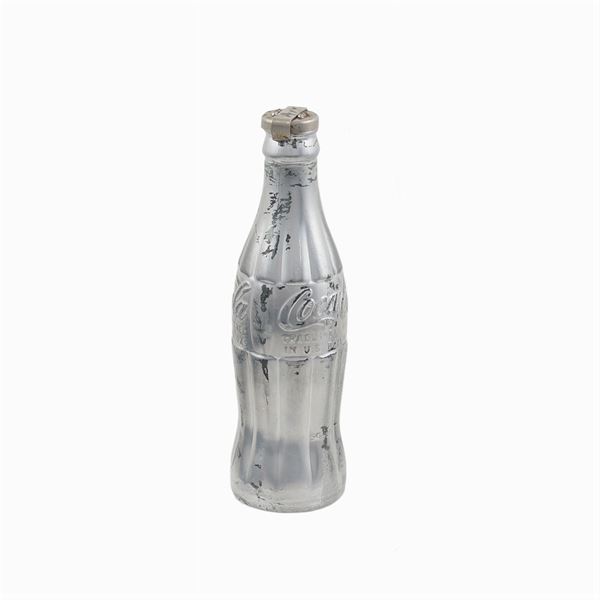 "Silver coke bottle", metà anni '70, scultura volume firmata con marker nero, entro teca in plexiglass. Certificato di autenticità della firma di Frank P. Garo Fhe - Forensic Handwriting Examiner, Coopersburg, PA. datato 11 settembre 2015, FPG # 27045 a, 20,3x6 cm.