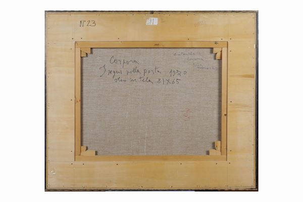 "I segni sulla porta", 1970, olio su tela, firmata in basso destra, entro cornice.
