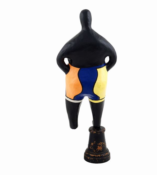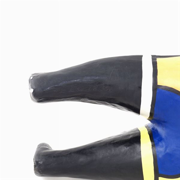 "Senza titolo", scultura in cartapesta colorata, poggiante su base a plintoi, h. 34,5 cm.