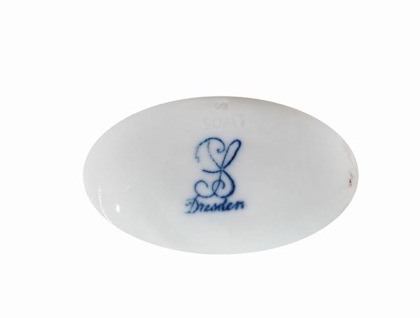 composto da una bowl di forma ovale e una coppetta di forma circolare, dipinte in policromia a raffigurare paesaggi entro riserve, manici a foggia di cigni, usure l, 12x31x18 - 10,5x18x13,5 cm.