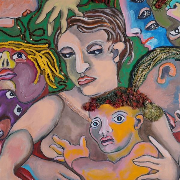 "Personaggi", 1988,acrilici e collage su tela, firmato in basso a sinistra, entro cornice.