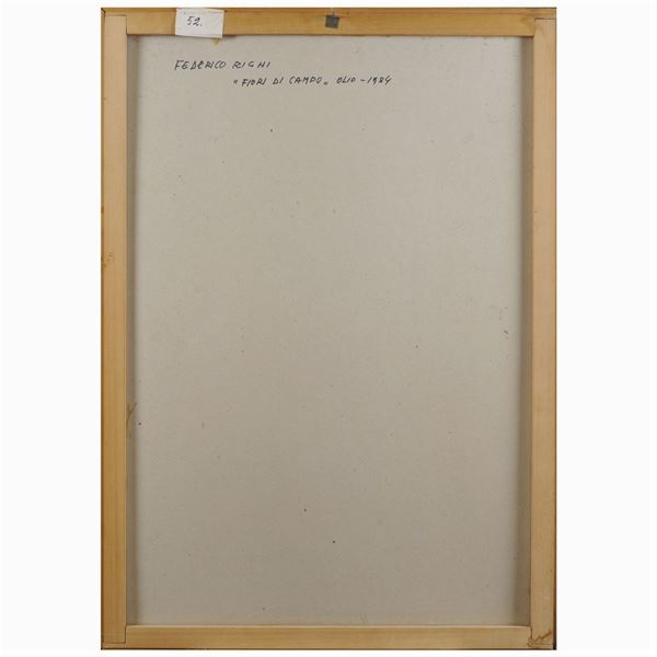 "Fiori di campo", olio su cartone, 1984, firmato in basso a destra, titolo e anno al verso, entro cornicen, 100x72