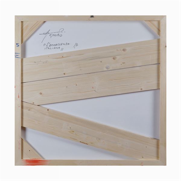 "Gnubo", tela estroflessa, 2016, firma e titolo al verso. Dichiarazione d'autenticità dell'artista su foto, n. opera 616=, 100x100 cm.