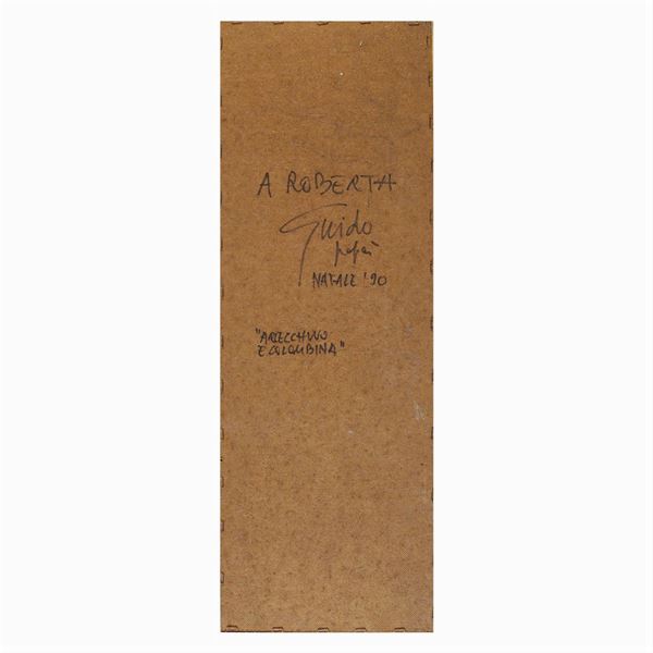 "Arlecchino e Colombina", tempera su faesite, 1990, firmato in basso a destra e sul retro, entro cornice s, 71,5x25,5 cm.