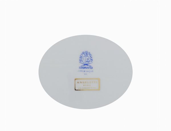 forma circolare a due manici, dipinto in policromia su fondo bianco decoro "Queen Victoria", marchio sotto la base , 28x31 cm.