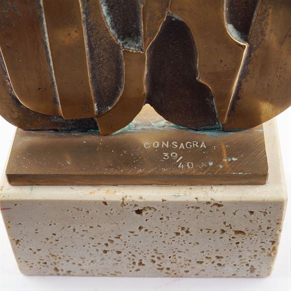 "Senza titolo", scultura multiplo in bronzo dorato, es. 39/40, firmata, poggiante su base in travertinoe, 26,5x12,5x5,3 cm.