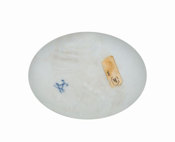 forma ovale a due manici con coperchio, dipinta in policromia su fondo bianco e parzialmente dorata A, 14x21x17 cm.
