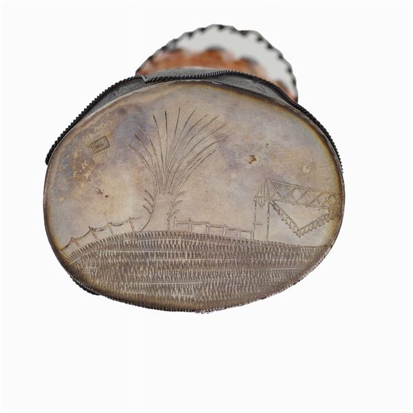 raffigurante una "manufica" poggiante su base in argento incisa a raffigurare un paesaggio T, h. 20