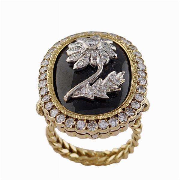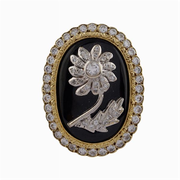 diamanti taglio brillante ct 1,50 circa e sezione ovale in onice nero su cui è applicato un piccolo fiore, misura 13, peso 20 gr.