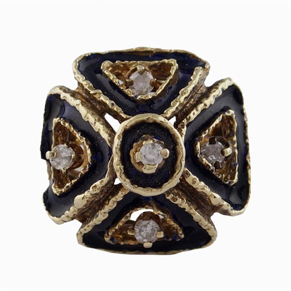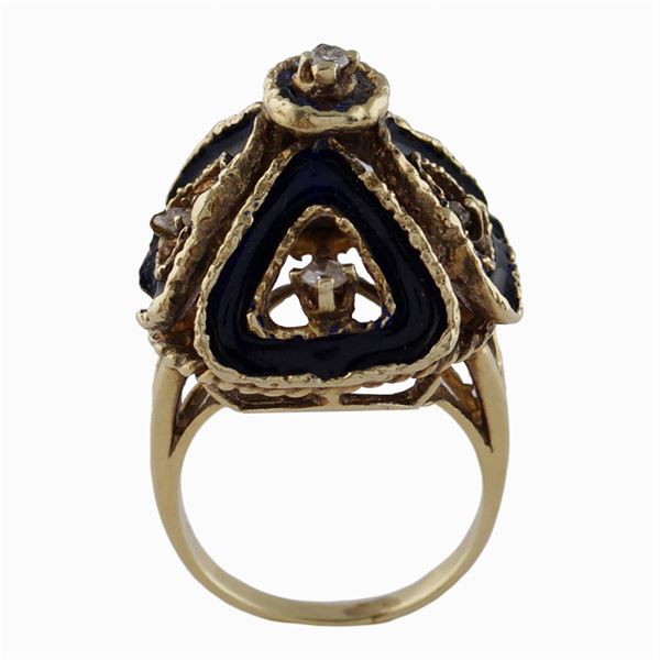 con stesura in smalto nella tonalità del blù e diamanti taglio brillante ct 0,25 circa, misura 15, peso 12,2 gr.