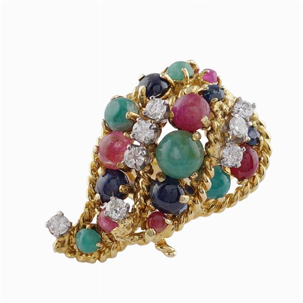 con rubini, zaffiri e smeraldi taglio cabochon ct 2 circa alternati da diamanti taglio brillante ct 0,50 circa, misura 12, peso 13,3 gr.