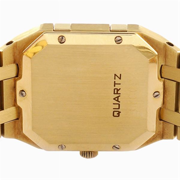 in oro giallo 18kt, cassa rettangolare mm. 29x38, ref. B70094, quadrante dorato con indici, vetro zaffiro, movimento al quarzo, bracciale originale in oro giallo 18kt, peso 115 gr.