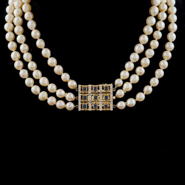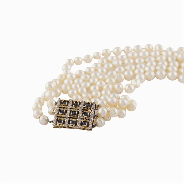 di forma irregolare da mm. 6,5 a mm. 9 circa con chiusura in oro giallo e bianco 18kt e zaffiri taglio carrè per ct 0,60 circa, lunghezza 40,5 cm., peso 109 gr.