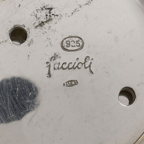 a forma circolare corpo liscio con profili e presa finemente cesellati a motivi vegetali, poggiante su quattro piedini ferini, orafo argentiere Faccioli - Milano, 27x27,5 cm., peso 1090 gr.