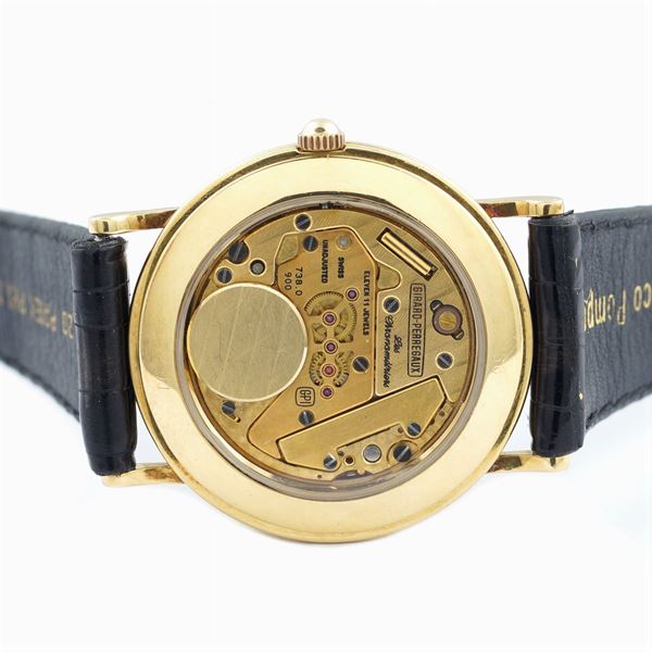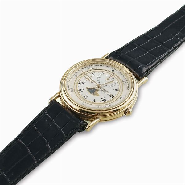 orologio da polso in oro giallo 18kt, cassa tonda mm. 34, quadrante bianco con numeri romani, calendario completo e fasi lunari, movimento scheletrico al quarzo, cinturino in pelle con fibbia in metallo dorato