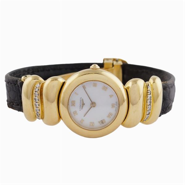 oro giallo 18kt, cassa tonda mm. 25 circa, quadrante in madreperla con numeri romani, movimento al quarzo eta 956031, bracciale in oro giallo e pelle con diamanti taglio brillante ct 0,25 circa, chiusura originale deployante in oro giallo