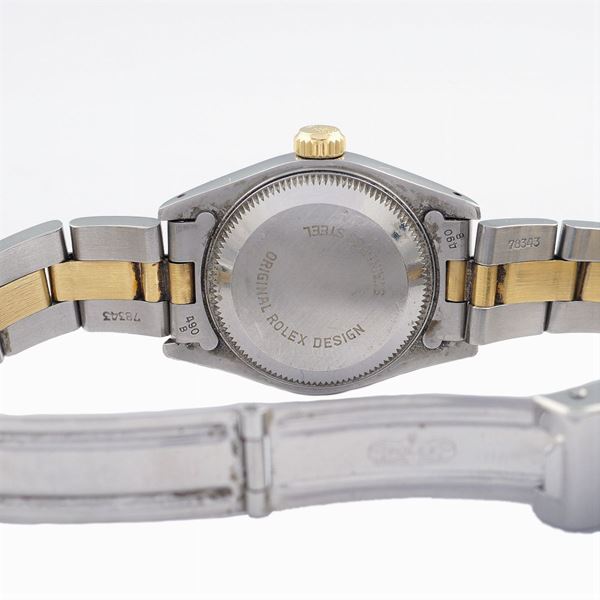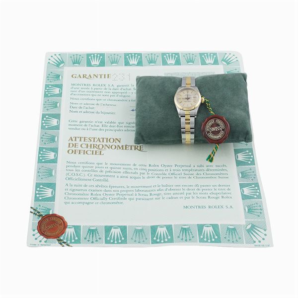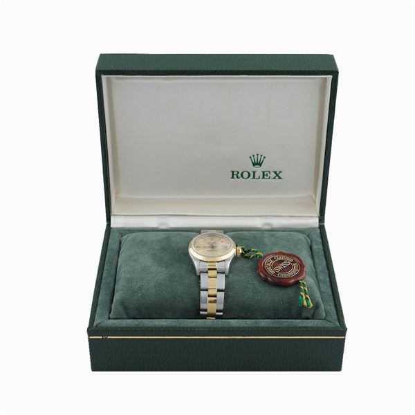 cassa tonda di mm. 26, ref. 9789022, quadrante champagne con indici e datario ore 3, vetro zaffiro (lievi difetti), movimento meccanico a carica automatica, calibro 2135, bracciale originale Oyster in oro e acciaio.