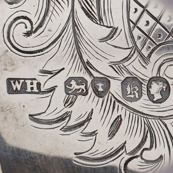 orafo William Hunter (1840 - 1884), composto da una teiera, una zuccheriera e una lattiera, base ottagonale, corpo sfaccettato e decorato con motivi vegetali, manici a voluta, teiera h. 18 cm., peso totale 1460 gr.