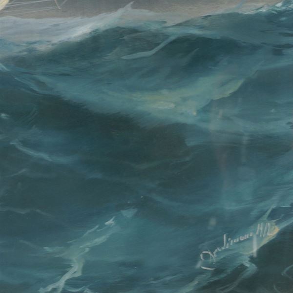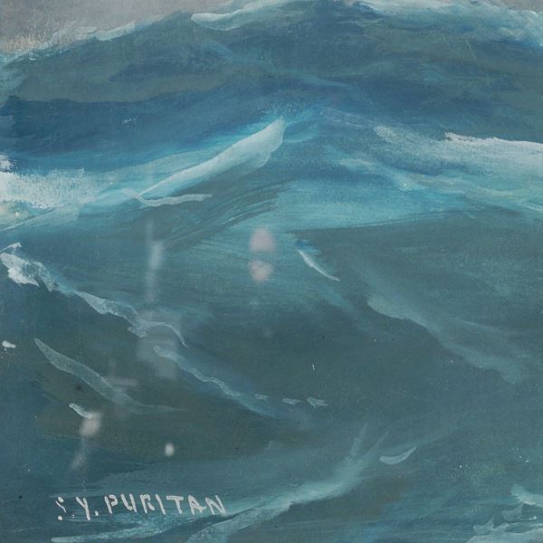 "Steam Yacht Puritan in mare aperto", gouache, 1912, firmata e datata in basso a destra, entro cornice, 60x80 cm.