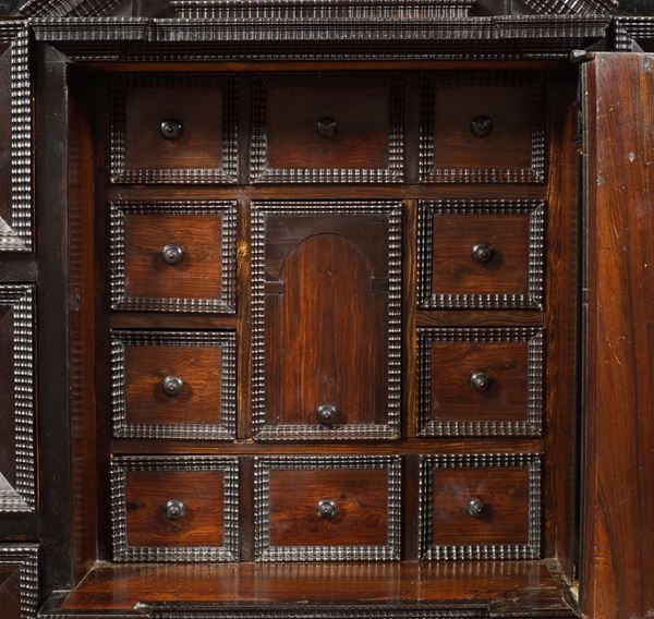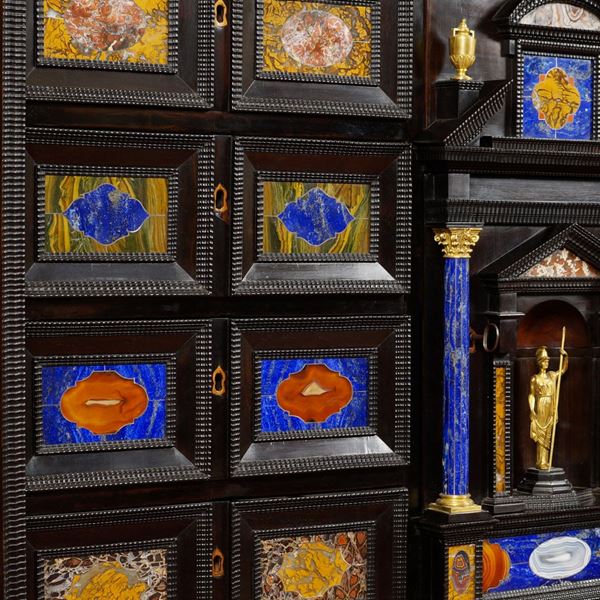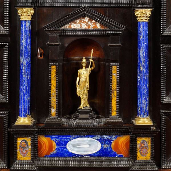 fronte di linea architettonica decorato con placche intarsiate con fili d'argento, diaspri ed agate policrome,sportello centrale delimitato da due colonnine in lapislazzulo e decorato con una scultura e altri elementi in bronzo dorato e cesellato, 71x122x35 cm.