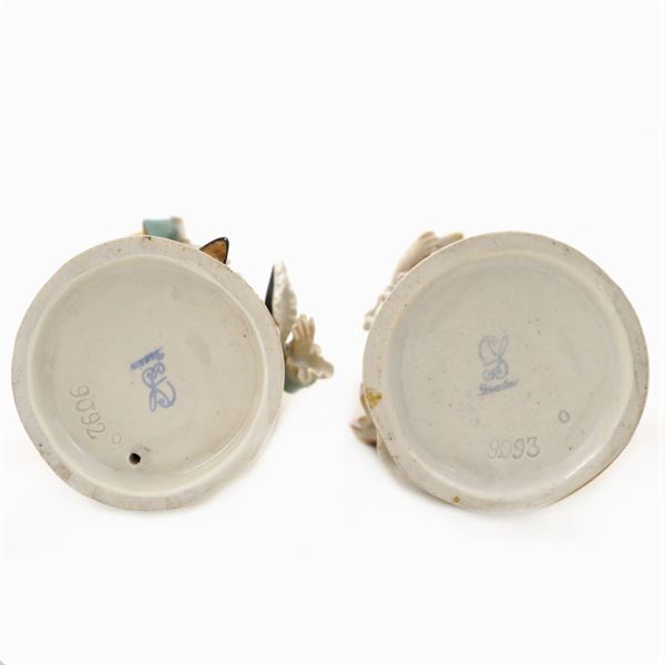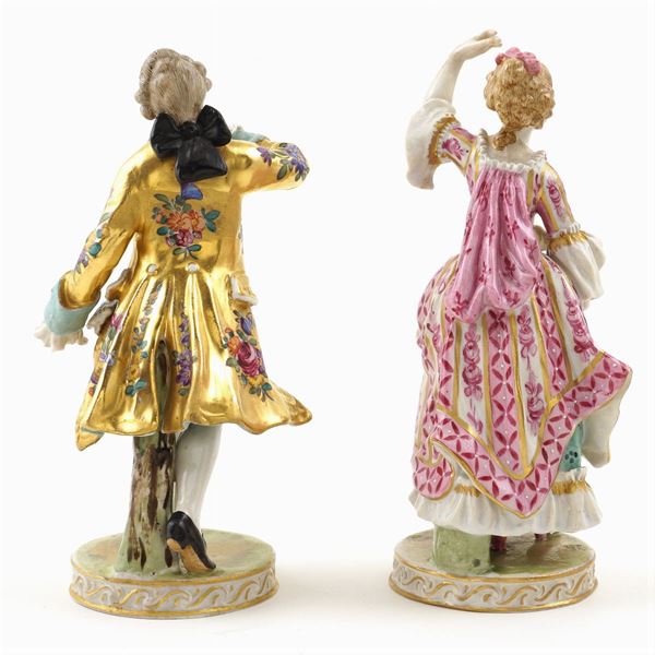dipinte in policromia e parzialmente dorate raffiguranti una coppia di personaggi in costume settecentesco, poggianti su base circolare, marchio sotto la base, h. circa 18 cm.