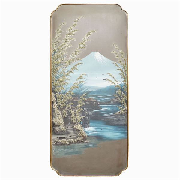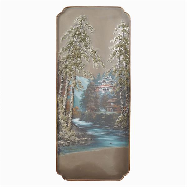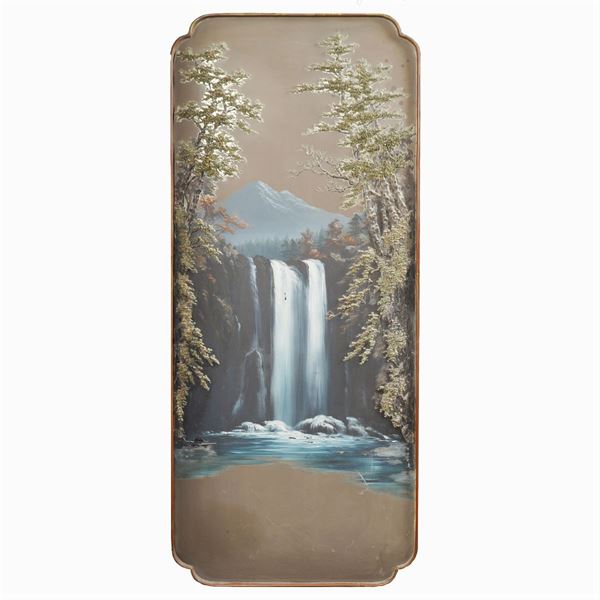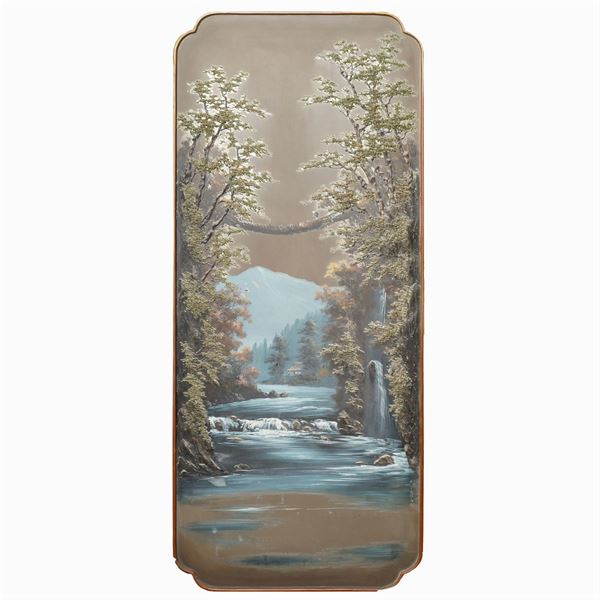 composto da quattro ante basculanti, pannelli centrali decorati a rilievo e dipinti in policromia con motivi paesaggistici, lievi difetti, 193x250 cm.