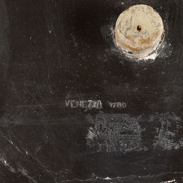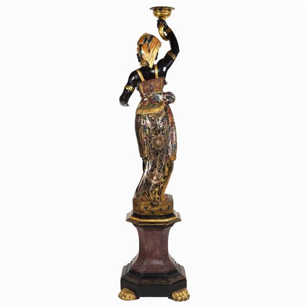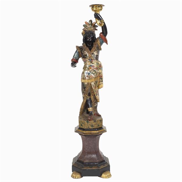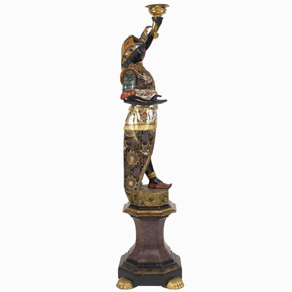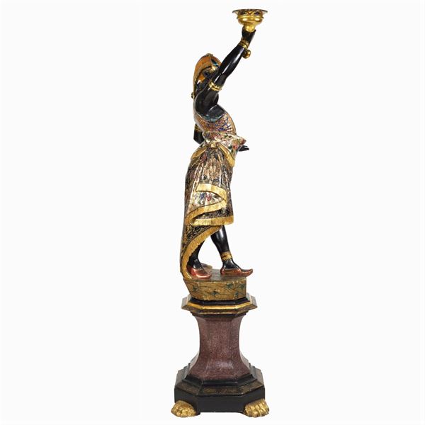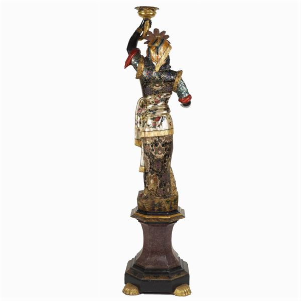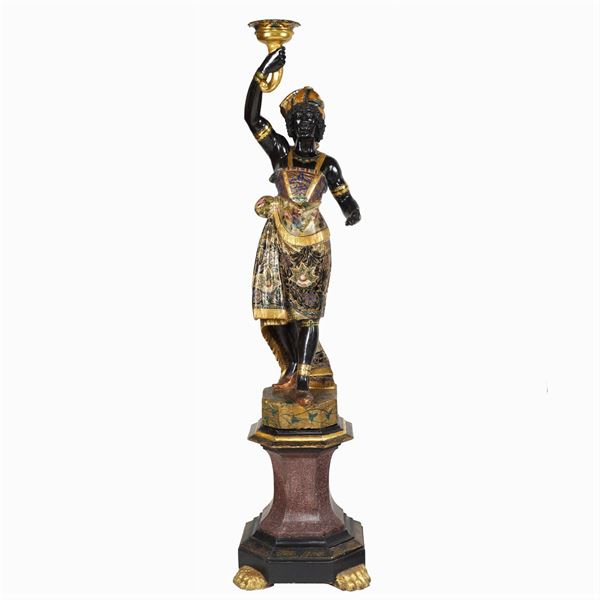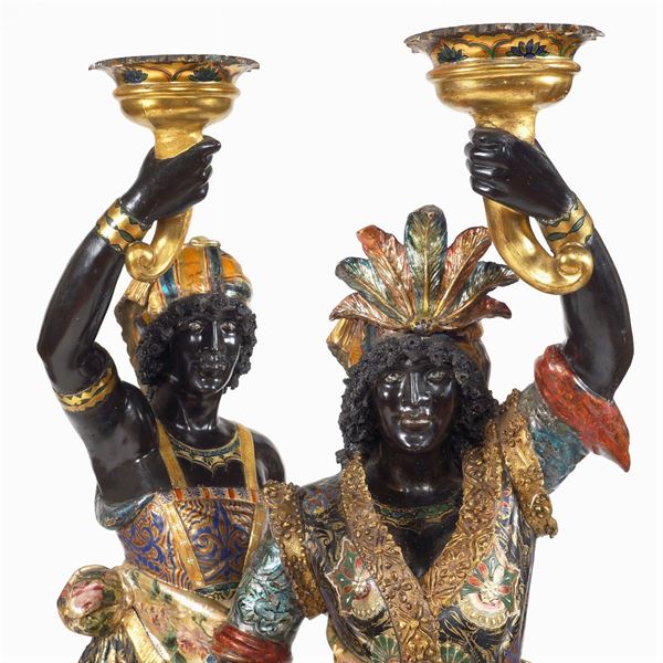 finemente scolpiti in legno ebanizzato parzialmente dorato a mecca, decorati in policromia con motivi floreali, poggianti su basi ottagonali dipinte a simulare il porfido con profili decorati in oro, lievi difetti e restauri, 225x50x50 cm.