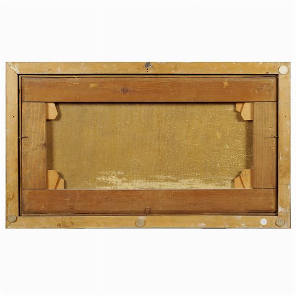 "Scena costiera con architetture e veliero", olio su tela, entro cornice in legno laccato e dorato, 38x71,5 cm.